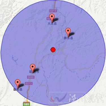 2013年7月25日云南贵州地震周边城市:彝良县距震中约20.3公里,昭阳区距震中约27.6公里,大关县距震中约28.0公里,鲁甸县距震中约48.4公里。