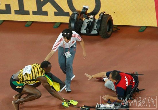 在昨天的北京世锦赛男子200米决赛之后,夺得冠军博尔特被摄像车撞到。随后世锦赛博尔特被撞视频被曝光,当时摄影师不小心撞上边上的护栏跟博尔特“追尾”。