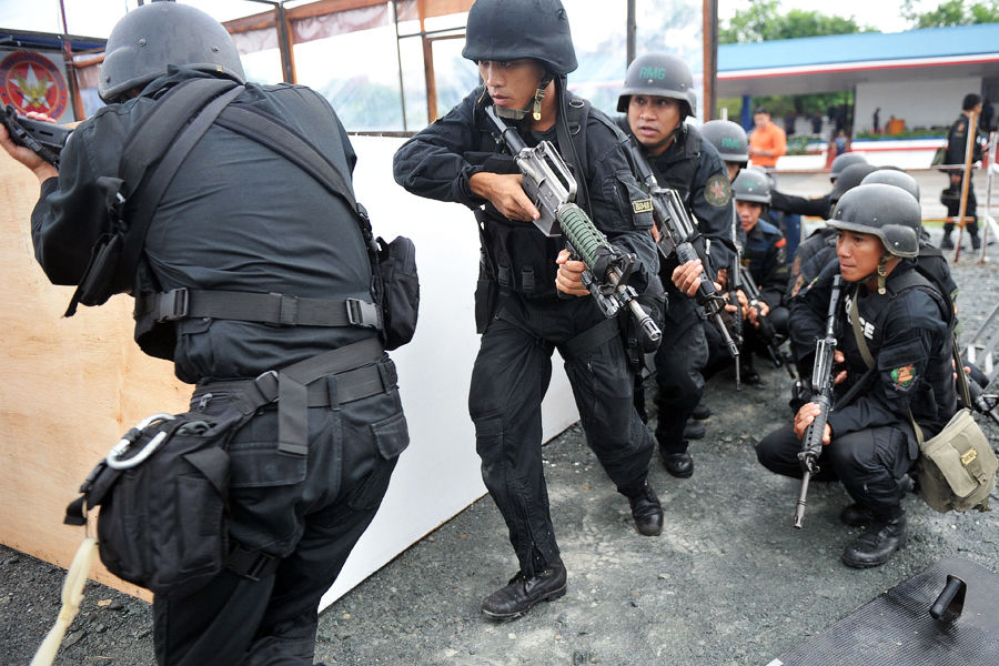 当地时间9月3日,几名菲律宾精英部队成员在演示配合突击技巧。调查委员会将传唤内政部次长、警察总长、警方谈判人员、马尼拉市政副市长等接受询问,4日则传唤马尼拉警署相关警官、巴士司机、事发当天载挟持者门多萨到马尼拉的一名神秘女子“萝丝”,以及在事发时访问门多萨的广播电台记者。