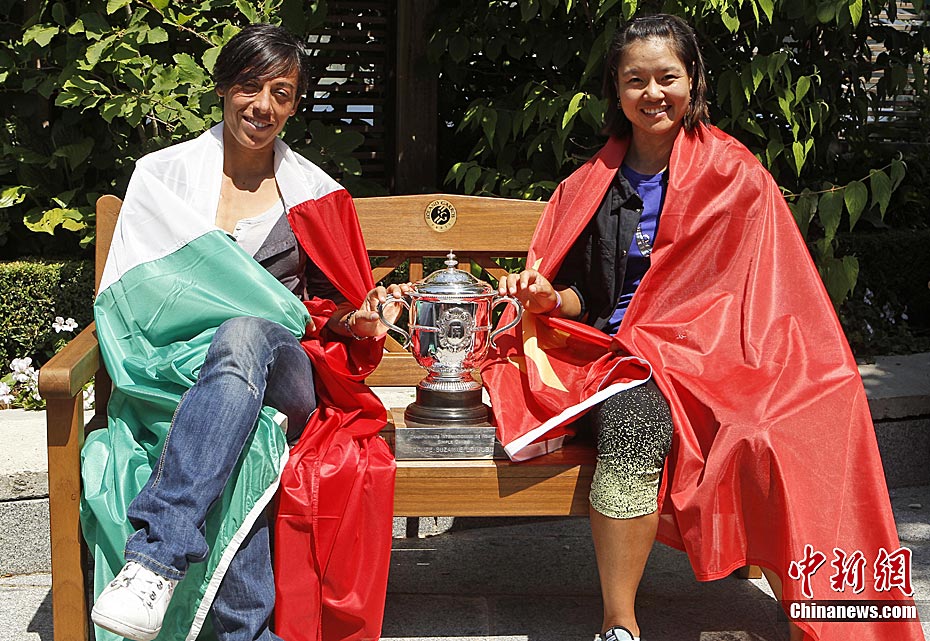 法网李娜斯齐亚沃尼强强对抗,李娜vs斯齐亚沃尼2比0,李娜夺冠,2011年法网红土球场上,五星红旗升起。李娜书写了中国网球历史。当地时间6月4日,法网女单决赛在罗兰·加洛斯体育场举行,由世界排名第五、中国选手李娜迎战世界排名第四、意大利选手斯齐亚沃尼。图为法网决赛前夕,中国选手李娜同意大利选手斯齐亚沃尼各披本国国旗,手握法网奖杯现身巴黎接受各国记者的采访。