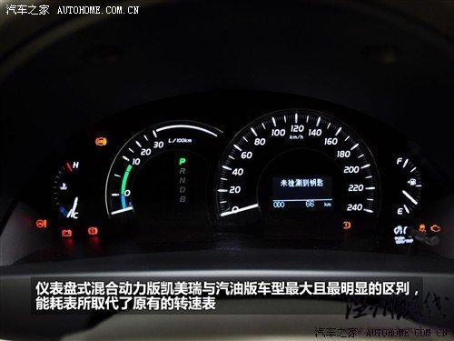 看到这里,也许会有读者说那么内饰部分还有什么可以介绍的呢?下面,编辑就和众网友一起用“大家来找茬”的方式细数这台混合动力版凯美瑞在内饰上与普通汽油版车型之间纯在的几处不同。1,仪表盘:油耗与能量回收表取代了原来的转速表。2,排挡杆:“D”挡后面多了一个“B”挡。3,后档风玻璃下方多了一个给蓄电池降温用的进风口。