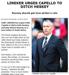 锋线上谁是鲁尼的搭档一直是个解决不了的问题:迪福和鲁尼风格太像不适宜同上,赫斯基懂得做球但进球太少,克劳奇更适合做替补奇兵,达伦·本特一到国家队就哑火。至今,卡佩罗还只能