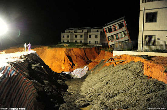 陵水黎族自治县黎安镇大墩村因台风带来的暴雨,将黄土冲刷后坍塌,冲出一个巨大的深坑,旁边的一栋三层民房由于地基较浅,出现整栋房子倾倒,幸好没有倒塌,没有造成人员伤亡。