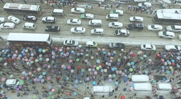 2015年11月24日,河南省迎来入冬首次大范围暴雪,路面湿滑造成交通堵塞。24日当天,郑州北郊刘庄公交车站近千人被滞留车站,撑起雨伞在雪中等车。暴雪天气给交通带来的影响很大,不过,这是天气原因,谁也没办法。